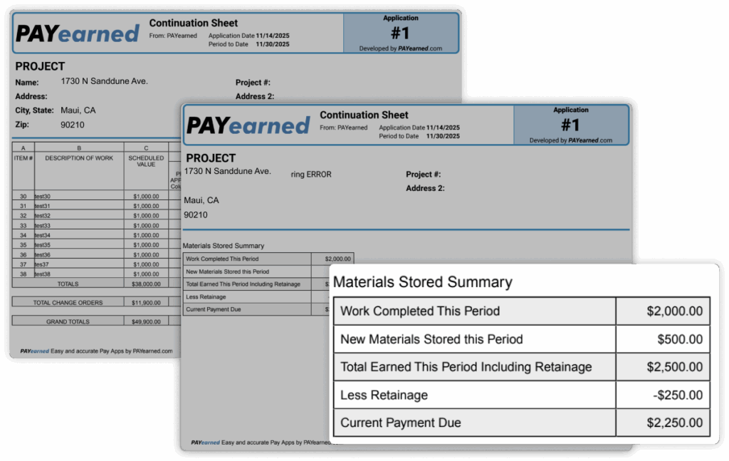 Generate professional pay applications effortlessly. PAYearned auto-calculates each line, including retainage, and material stored so your pay apps stay organized, error-free, with automatic filing and built in search retrieval.