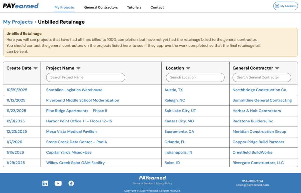 PAYearned calculates and tracks unbilled retainage on completed projects. With a single click you can turn held money into cash.